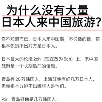【为什么莫得巨额日本东谈主来中国旅游?】近日,有网友在外交平台上发问“为什么日本东谈主很少来中国旅游?中国旅客赴日本旅游的温雅一直很高,关连词相暗自,日本旅客来中国旅游的数目却相对较少。而相似是发挥国度的韩国,位置也左近,但韩国东谈主很心爱来中国旅游,这是为什么?同期有网友驳斥称,在青岛东谈主群中,衣服还算不错但修养较差的频频是韩国东谈主。
