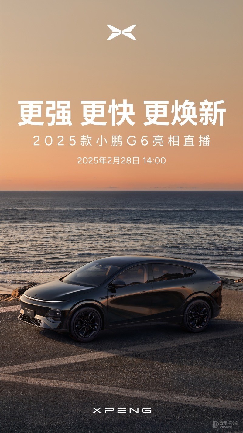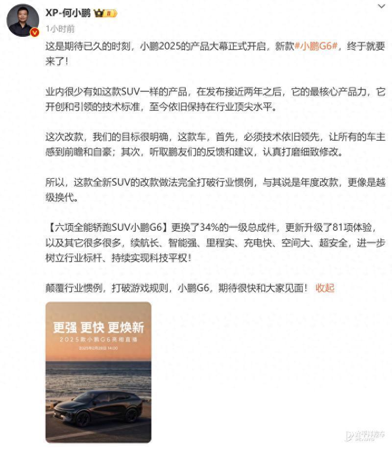 【太平洋汽车 新车频说念】2月26日,小鹏汽车董事长何小鹏文书新款小鹏G6(询底价|查参配)将于2月28日通过直播步履厚爱亮相,何小鹏将这次改款称为“越级换代”,新车更换了34%的一级总成件,并升级了81项体验。