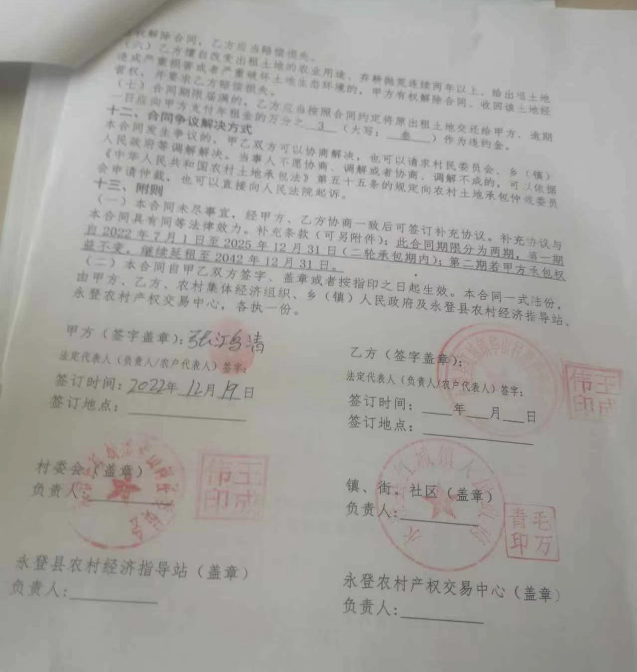 该协议题名时刻为2022年12月19日,除有签有张鸿清名字外,还盖有乙方华山村股份经济融合社公章、华山村村委会公章、红城镇政府公章及关联精致东谈主私章。但协议上永登县农村经济劝诱站、永登县农村产权往复中心盖印处均为空缺。