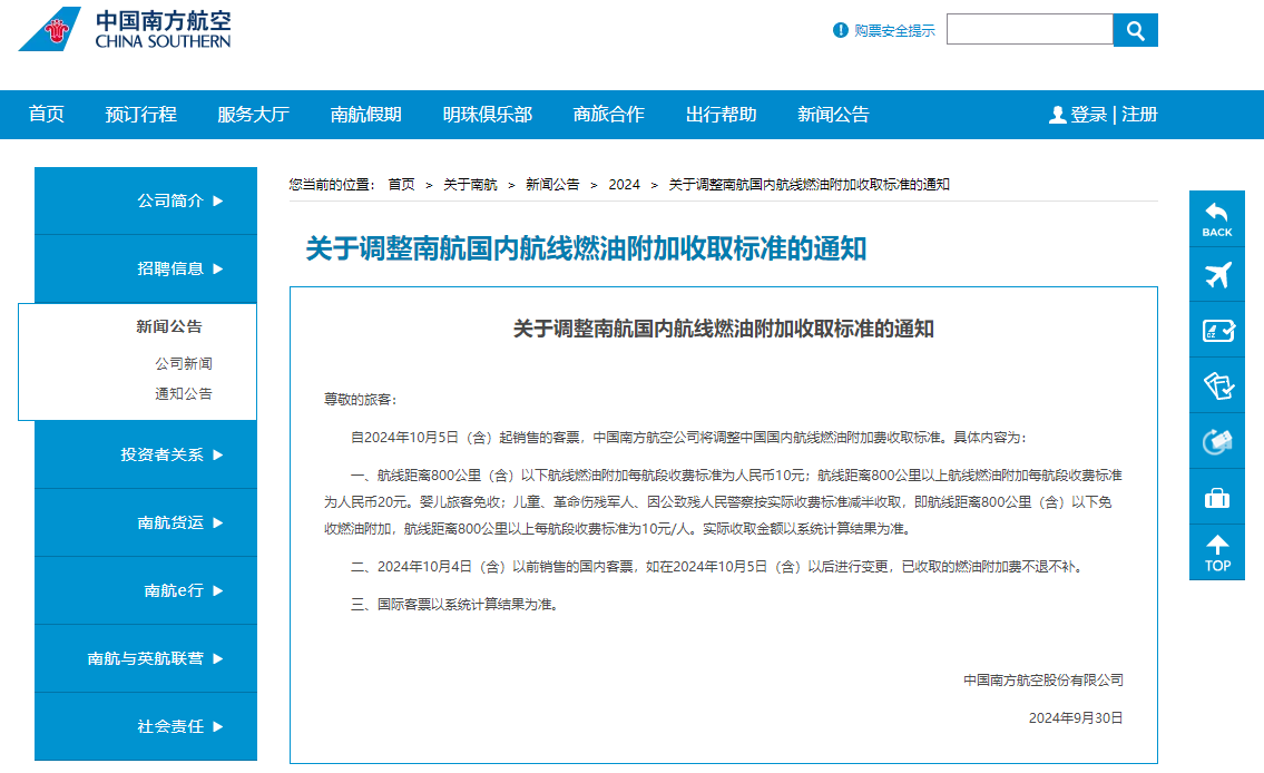近日,国航、南航、东航、川航等多家航司奉告自2024年10月5日(出票日历)起下调国内航路燃油附加费:自2024年10月5日(含)起销售的客票,将调遣中国内地国内航路燃油附加。800公里(含)以下航路燃油附加每航段为东说念主民币10元;800公里以上航路燃油附加每航段为东说念主民币20元。具体收取金额以系统自动推断效果为准。