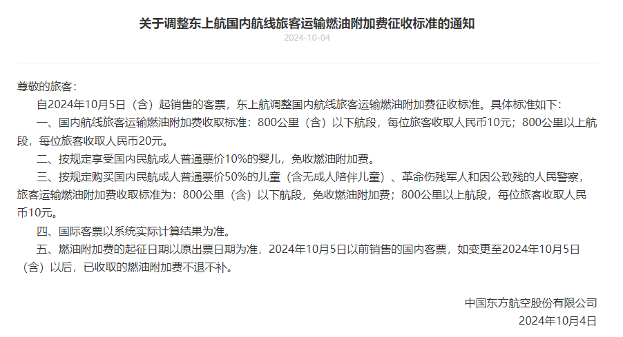 需郑重,燃油附加费价钱按出票时间推断。10月5日之后出票,工夫享有新价钱。10月5日之前出的票,即即是10月15日才出行,燃油附加费也依然蓝本的30元和50元。