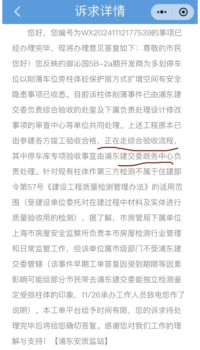 浦东安质监站则示意,御沁园5B-2a期的柱体削薄事件已由浦东建交委细致概括验收的处室及下属细致处理假想修改事项的审查中心等单元共同处理。该工程蓝本已由参建各方结束验收及格,正在走概括验收历程其中泊车库专项验收事宜由浦东建交委政务中心细致处理。