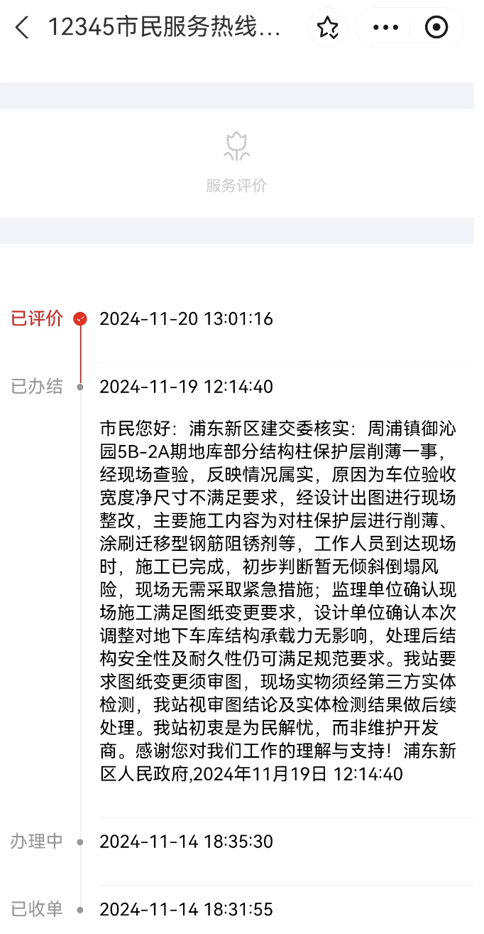 浦东新区政府在一份回复材料中示意,周浦镇御沁园5B-2A期地库部分结构柱保护层削薄一事,经现场检验,反馈情况属实,原因为车位验收宽度净尺寸不闲逸条目,经假想出图进行现场整改,主要施工内容为对柱保护层进行削薄、涂刷挪动型钢筋阻锈剂等,责任主谈主员到达现场时,施工已完成,初步判断暂无歪斜倒塌风险,现场无需招揽进击顺次。