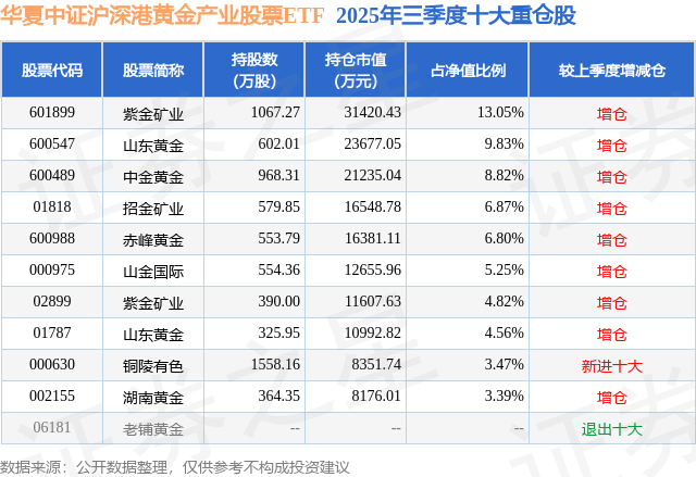 从基金范畴来看,中原中证沪深港黄金产业股票ETF基金2025年三季度公布的基金范畴为24.09亿元,较上一期范畴6.04亿元变化了18.05亿元,环比变化了299.07%。该基金最新一期钞票成就为:股票占净值比98.13%,无债券类钞票,现款占净值比1.46%。从基金合手仓来看,该基金当季前十大股票仓位达66.86%,第一大重仓股为紫金矿业(601899),合手仓占比为13.05%。