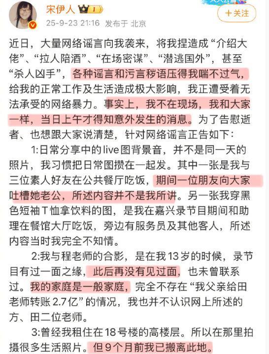 搜狐文娱讯 9月23日晚,宋伊东谈主发长文回复近期收罗争议,她示意我方并不在现场,事发上昼才知谈不测发生的音书。此外,她称我方是一般家庭,也不料志什么“成本大佬”。现在,她还是就鬼话和网暴向公安机关报警。