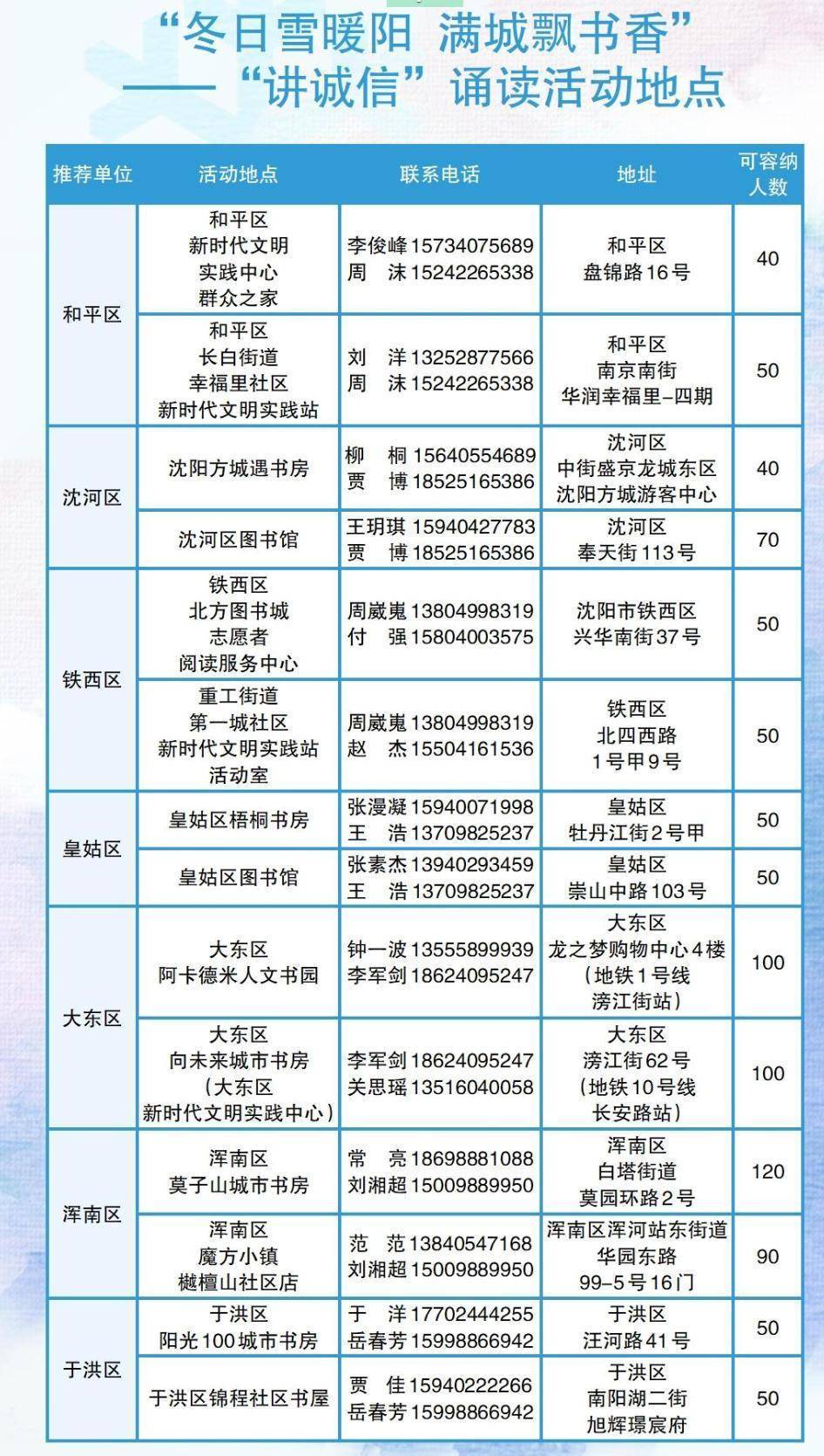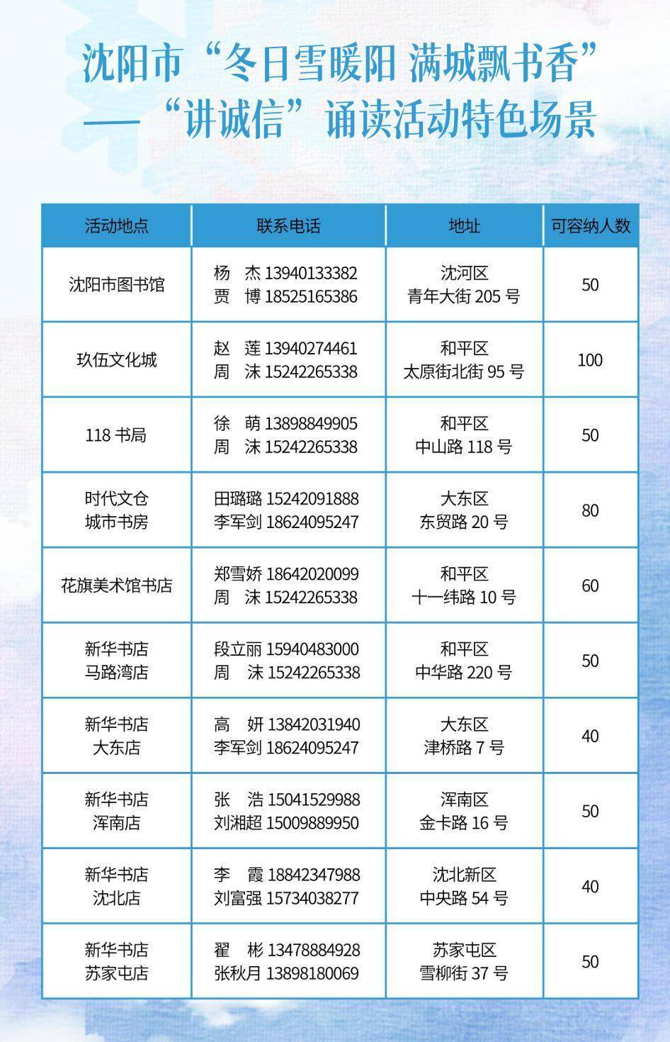 12月的每周三,沈阳发布客户端将会发布当周周末各朗诵场地开展“冬日雪暖阳 满城飘书香”——“讲诚信”朗诵四肢共享会的具体本领,敬请存眷。